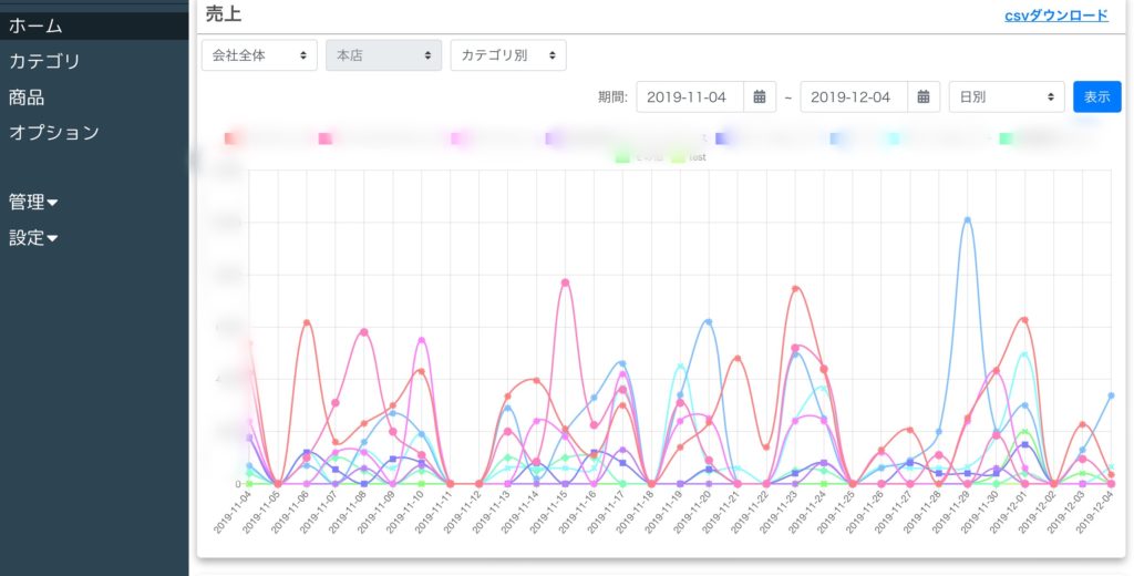 売上データは蓄積されておりCSVファイルでダウンロードできるので、自由に分析可能です。