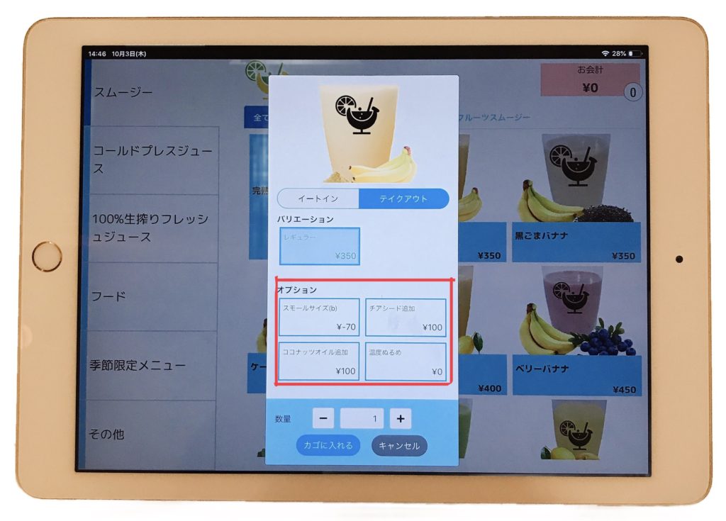 0レジでは商品を選ぶと、その商品に合わせられるオプションメニューが表示されます。